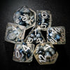 Set forth on your next quest with these fighter's dice, crafted for tabletop role-playing games. Each die features a mesmerizing clear resin with a miniature copper shield embedded within, perfect for the daring adventurers who remain composed and strategic in the heat of battle.