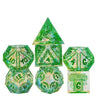 This sharp-edged dice set combines the playful aesthetic of candy wrappers encased within each die, alongside intricate patterns adorning the exterior. The vibrant and reflective internal elements capture the charm of nostalgic candy wrappers, while the detailed exterior designs add an extra layer of elegance and mystique. Ideal for players who enjoy a blend of whimsy and sophistication, these dice bring a unique and visually captivating element to any tabletop adventure. Perfect for those who appreciate a mix of playful and intricate details in their gaming accessories.