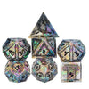 This sharp-edged dice set features a captivating blend of candy wrappers encased within each die, complemented by an intricate Medusa pattern on the exterior. The reflective and colorful interior elements evoke the charm of nostalgic candy wrappers, while the Medusa-themed designs add a touch of mythological intrigue and elegance. Ideal for players who enjoy a unique fusion of playful and classical aesthetics, these dice offer a visually stunning experience. Perfect for adding a mix of whimsy and ancient mythology to your tabletop sessions.