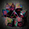 Behold this captivating set of hand-painted dice, perfect for your next epic quest in the realm of tabletop adventures. Crafted from acrylic infused with a mystical metallic shimmer, these dice create a mesmerizing display that seems to whisper tales of ancient bards and legendary heroes.