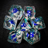 Delve into a thrilling journey with this set of 7 resin-filled dice! Each die features a unique design, including white font, blue mushrooms, and clear brown accents. Get ready for an adventure like no other as you roll your way to victory with these one-of-a-kind dice.
