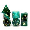 This dice set is made from cat's eye, a gemstone known for its unique optical effect that resembles a cat's eye. The band of reflected light moves just beneath the surface, creating a shimmering, luminous line that adds a captivating and magical quality to the dice. This effect is caused by light reflecting off parallel bundles of tiny hollow tubes or fibrous crystals of another mineral inside the gemstone. Used throughout the centuries to decorate and as jewelry, their bright colours are unmistakable and still captivate people with their beauty to this day. As each die is carved from a different stone, no two will ever be the same, ensuring you receive a set that is unique from any others. This purple Cat's Eye dice set with gold font embodies the mystic energy of arcane wizards and enigmatic sorcerers, perfect for those who delve into the unknown. Enhance your gameplay with these mesmerizing dice and let their enchanting appearance bring a touch of magic to your adventures.