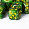 The dice features a striking combination of Green resin and a Gold Font colour.