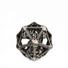 The dice features a striking combination of White acrylic and a Grey font colour.
