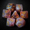 Adventure awaits with this captivating set of dice, perfect for any tabletop role-playing game. Each die is a mesmerizing blend of colorful resins, swirling together to create a visual masterpiece akin to silk. The ethereal beauty of these dice is sure to enhance your gaming experience.