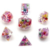 The dice features a striking combination of White, Pink resin and a Green Font colour.