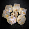 Behold this captivating set of hand-painted dice, perfect for your next epic quest in the realm of tabletop adventures. Crafted from acrylic infused with a mystical metallic shimmer, these dice create a mesmerizing display that seems to whisper tales of ancient bards and legendary heroes.