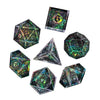 This sharp-edged dice set features a captivating blend of candy wrappers encased within each die, complemented by an intricate Medusa pattern on the exterior. The reflective and colorful interior elements evoke the charm of nostalgic candy wrappers, while the Medusa-themed designs add a touch of mythological intrigue and elegance. Ideal for players who enjoy a unique fusion of playful and classical aesthetics, these dice offer a visually stunning experience. Perfect for adding a mix of whimsy and ancient mythology to your tabletop sessions.