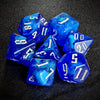 The dice features a striking combination of Blue, White, Sky Blue acrylic and a White font colour.
